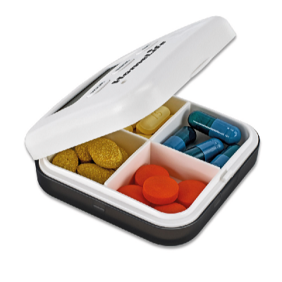 Egy napos gyógyszeradagoló. Funkciók: óra, ébresztő, időzítő. 4 rekesz, hang- és rezgésjelzés.