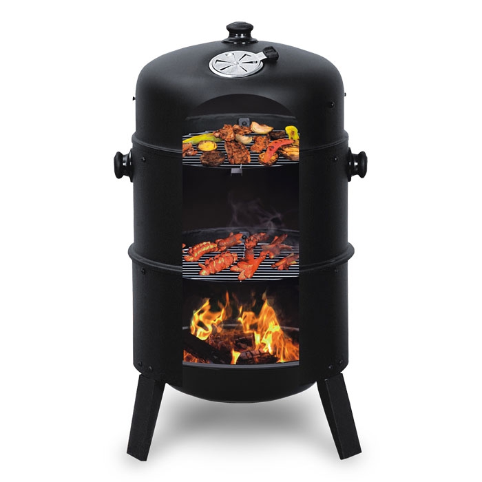 A grillező 3 különálló egymásra helyezhető részből áll, amelyeket kombinálva használhatja füstölés vagy grillezés céljából. A két alsó rész ajtóval felszerelt, így könnyen ellenőrizheti a tűz állapotát, a fedő hőmérővel és füstkieresztő szeleppel ellátott. A grillezés vízgőz felett történik. Ennek köszönhetően a zsiradék nem ég le és nem keletkeznek karcinogén anyagok.