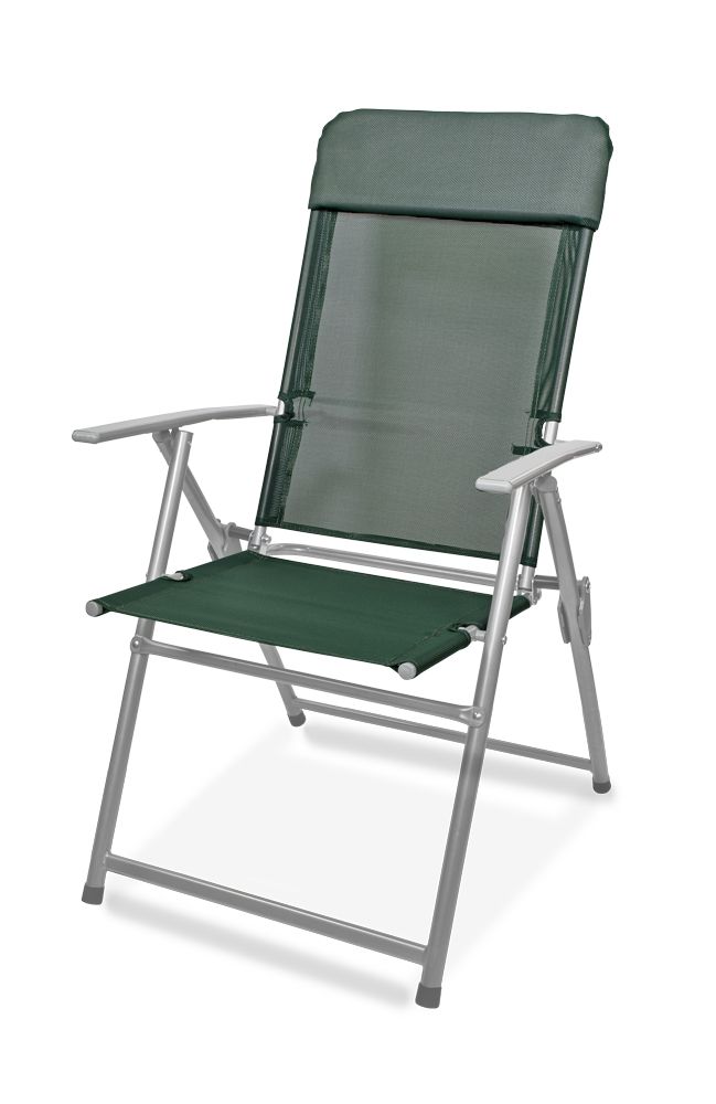 Összecsukható kerti karosszék karfával, anyaga fém (porszórt felület - komaxit ezüst) és műanyag szövet (poliészter), vízlepergető. A kerti szék összecsukható és dönthető is (3 pozícióban).