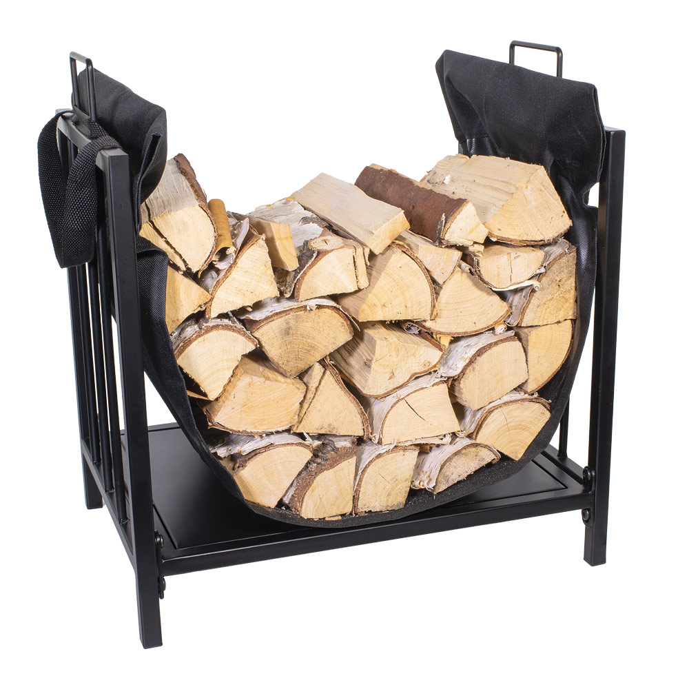 A tűzifa tároló állvány biztosítja a rendet és tisztaságot a kandalló körül. Beltéri és kültéri kandallókhoz egyaránt alkalmas. A készlet része egy praktikus nejlonszövet hordozó, amely lehetővé teszi a fahasábok egyszerű szállítását a kandallóhoz. Fekete, elegáns kialakításának köszönhetően a tároló állvány nem csak praktikus tárolóként, hanem a belső tér dizájnos kiegészítőjeként is jó szolgálatot tesz.