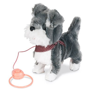 Interaktív elemmel működő, sétáló kutyus pórázzal.