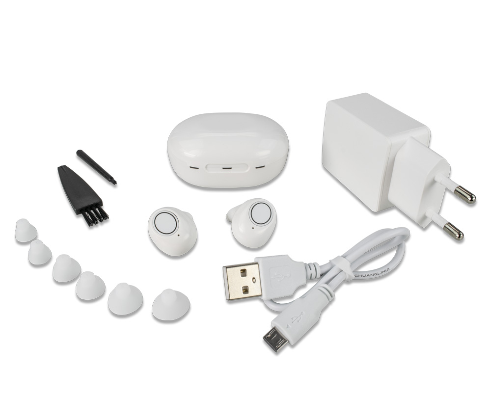 2 hangerősítő (1x jobb és 1x bal fülbe), töltő tok, adapter, USB-kábel, 6 higiénikus fej, kefe, műanyag tisztító