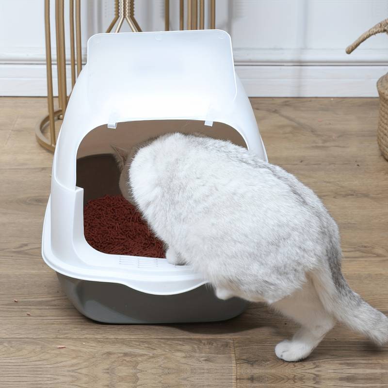 Praktikus macska- vagy kisállat-toalett modern kialakítással. Olyan helyiségekben is elhelyezheti, ahol gyakran tartózkodik, mivel a szag csökkentésére szolgáló szénszűrő is része a készletnek.A macskák egyszerűen átmehetnek a lengőajtón.